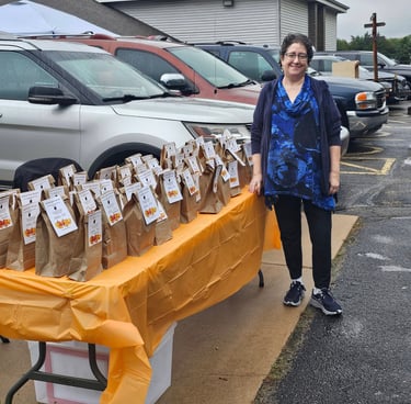 Sacks are filled with candy, games and a tract, along with an invitation to the chapel.